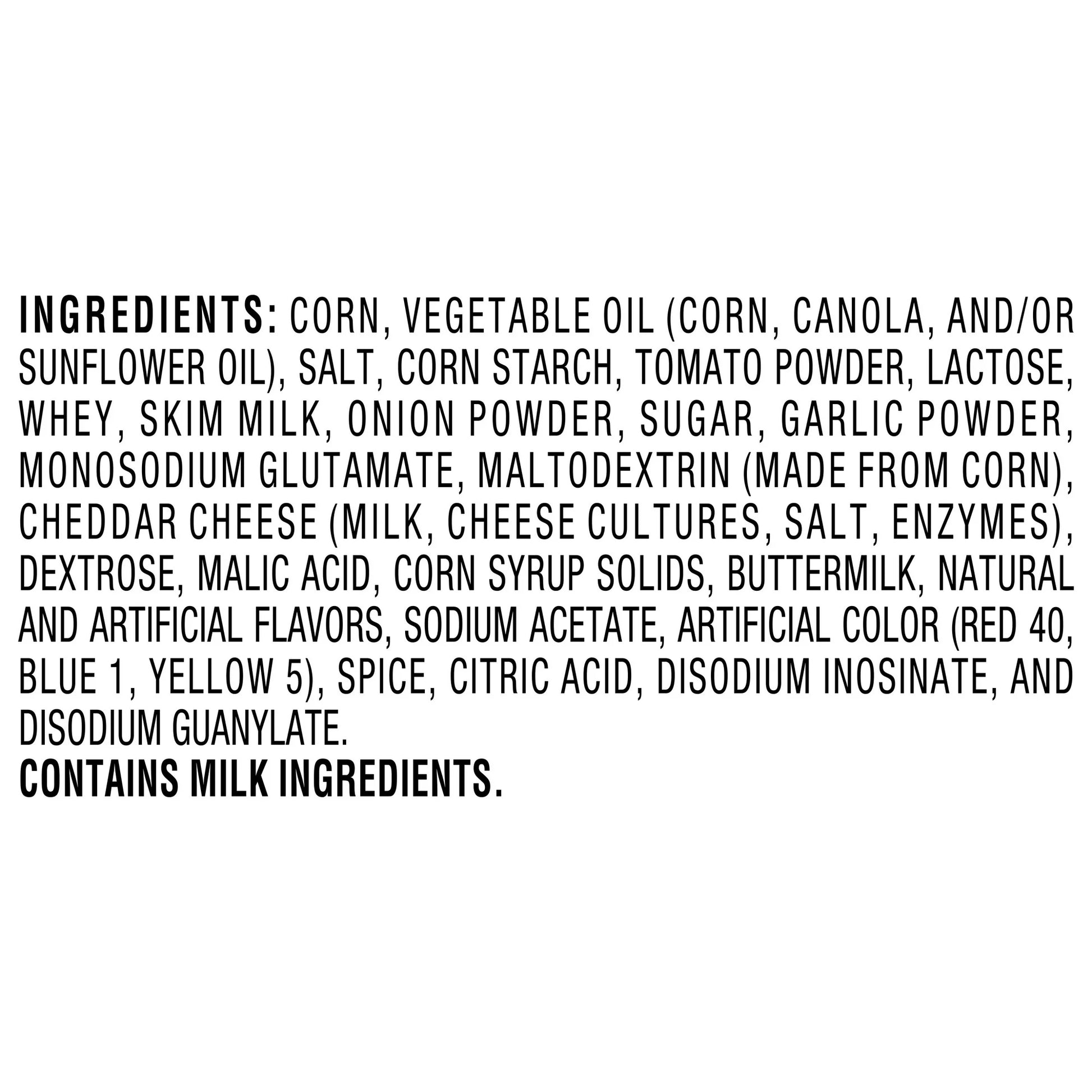 Contains corn, vegetable oil, salt, tomato powder, lactose, whey, onion powder, sugar, garlic powder, MSG, maltodextrin, cheddar cheese, dextrose, malic acid, syrup solids, buttermilk, natural and artificial flavors, sodium acetate, artificial colors, spices, and citric acid.